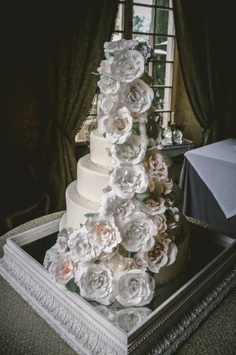 The cake was a glamorous 7-tiers in a classic ivory icing. Decorated with an exuberant, hand-sculpted sugar flower cascade in silver and blush for ultimate romance. It was contrasted with a border of edible diamonds.