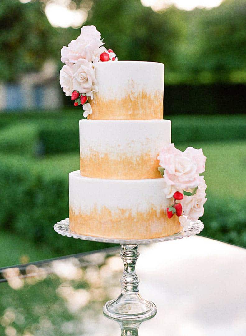 The tiered cake designed by Melanie Secciani, featured luxurious brushed gold on white fondant. The fun and whimsical design was perfectly accompanied by delicate pastel sugar flowers and clusters of delightfully sculpted strawberries to add pops of bright colour.